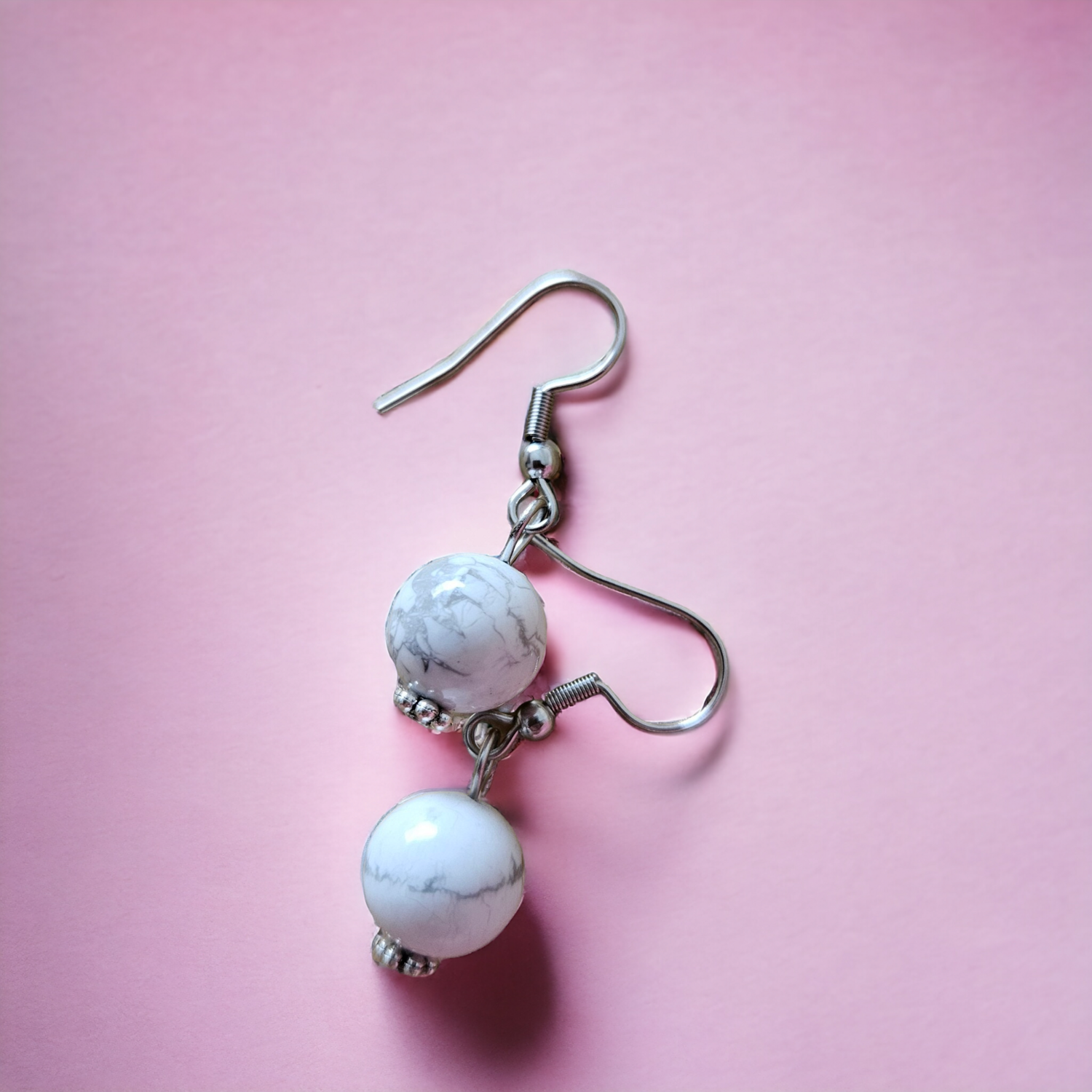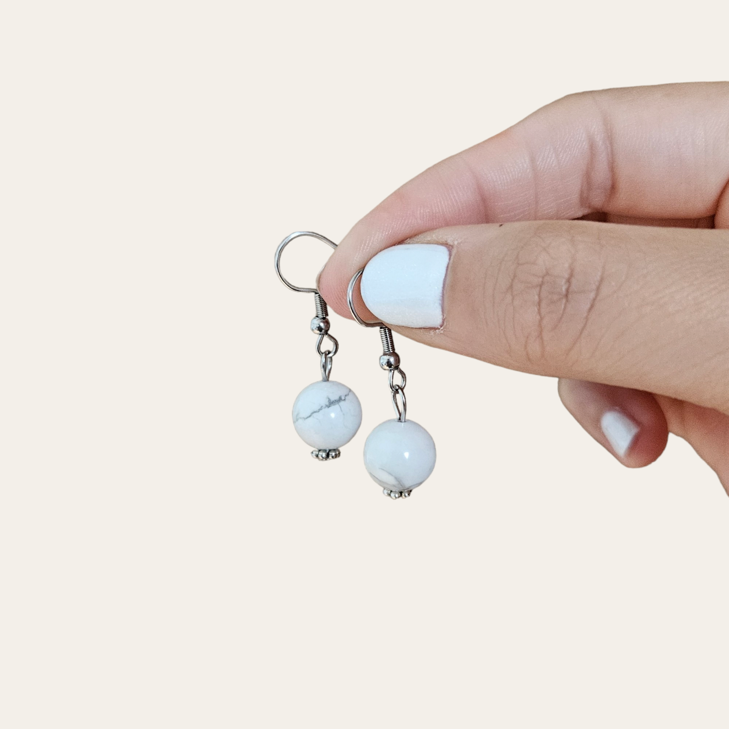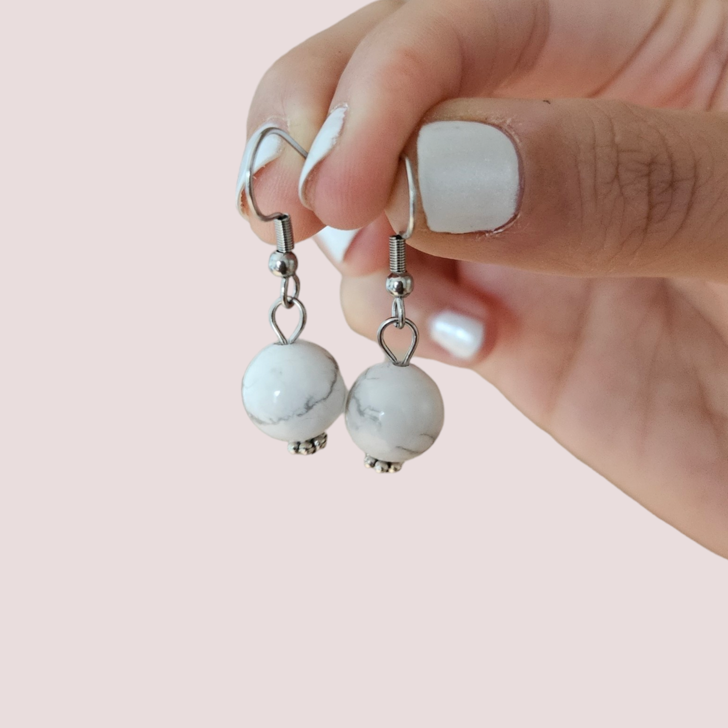 Caravanas con cuentas de piedra de howlita de 10mm de acero quirúrgico.