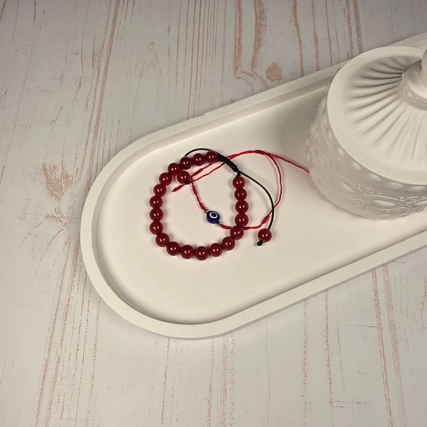Incluye una pulsera de cornalina de 8mm ajustable y una pulsera de hilo con ojo turco.