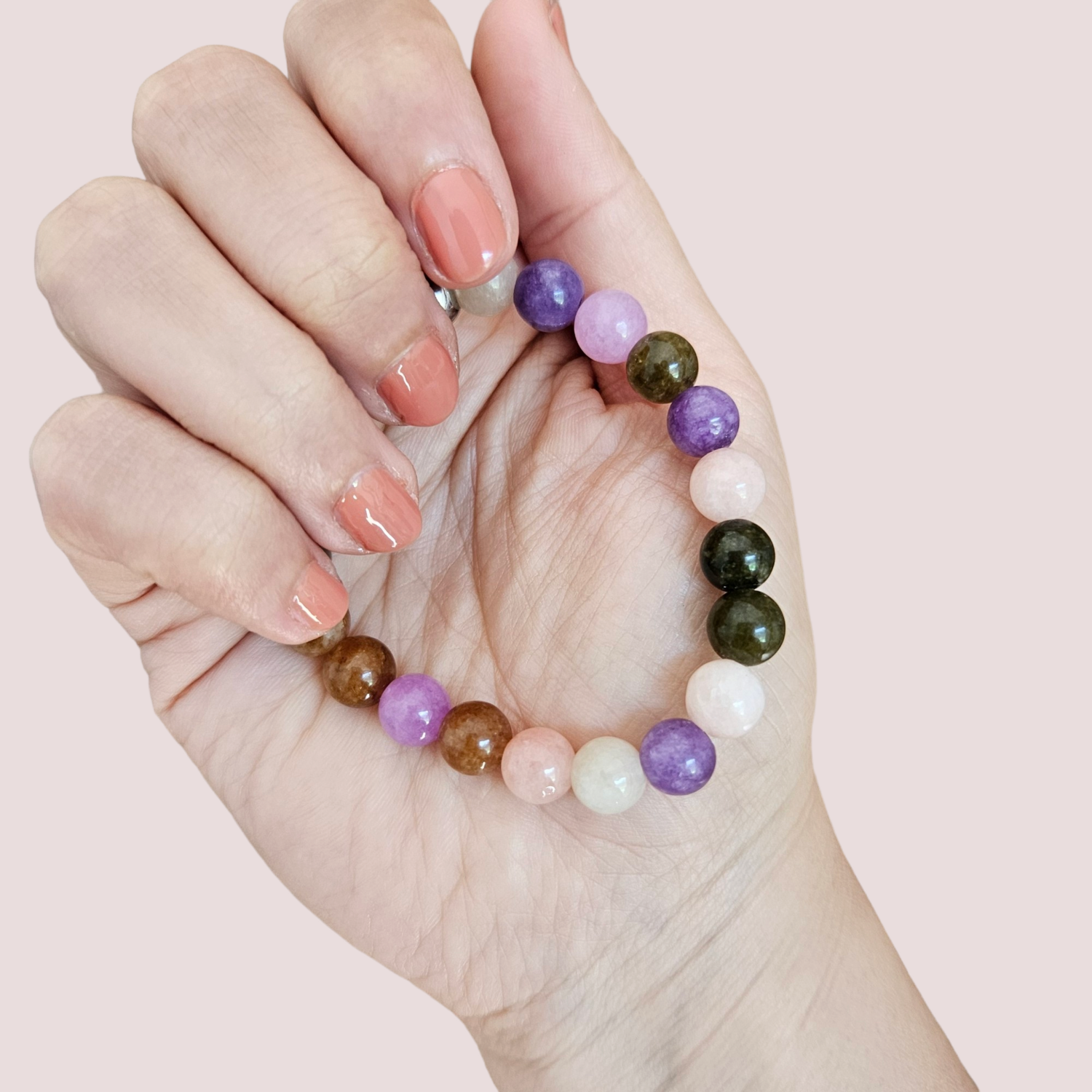 La pulsera equilibrio está formada con mix de piedras de jade Oliva y Morado.
