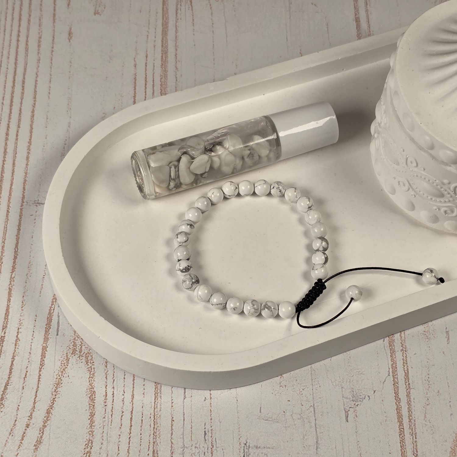 El pack contiene 1 pulsera de howlita ajustable de 6mm y un roll on con aceite esencial de sándalo.
