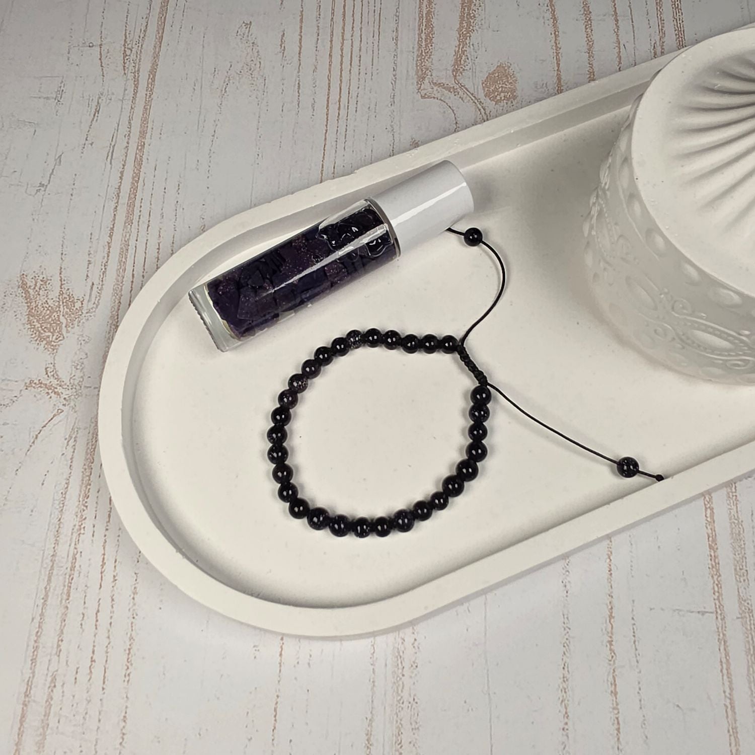 El pack contiene 1 pulsera de lluvia de estrellas 6mm ajustable y un roll on con aceite esencial de ruda.
